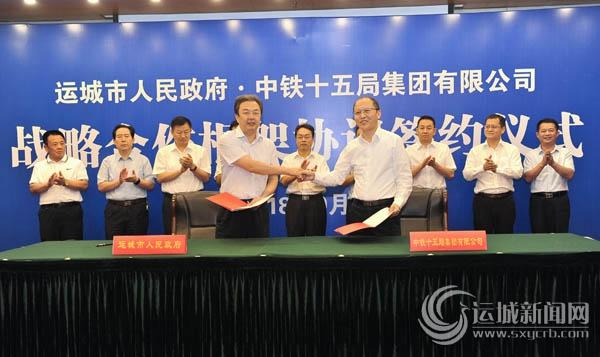 本网讯(记者 张 越)9月13日,市政府与中铁十五局集团有限公司签署战略合作框架协议。双方将在公路、高速铁路及民生基础设施等领域深入交流,开展全方位合作,这将加速大运城的城市基础设施建设步伐,助推全市转型发展、高质量发展。中铁十五局集团有限公司党委书记、董事长张喜胜,市委副书记、市长朱鹏,副市长卫再学出席签约仪式。市政府秘书长张保安主持。