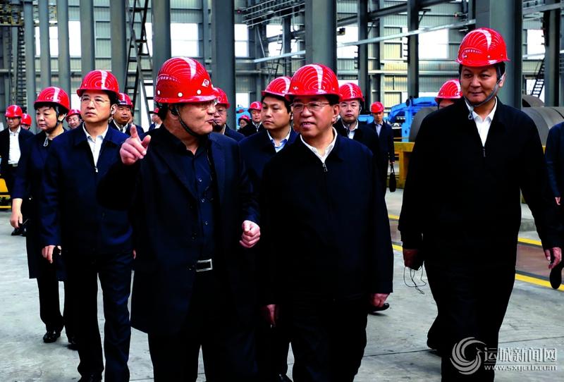 5月9日,市委书记刘志宏率领我市党政考察团在韩城市委书记褚锦锋(前排右一)等陪同下,在韩城市友发钢管有限公司考察。记者 雷哲侠 摄