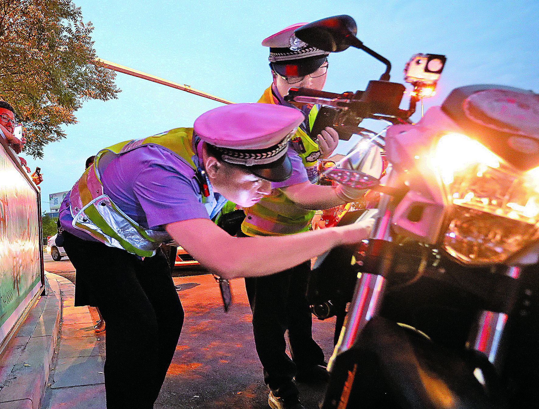▲民警在检查摩托车相关信息 樊朋展 摄