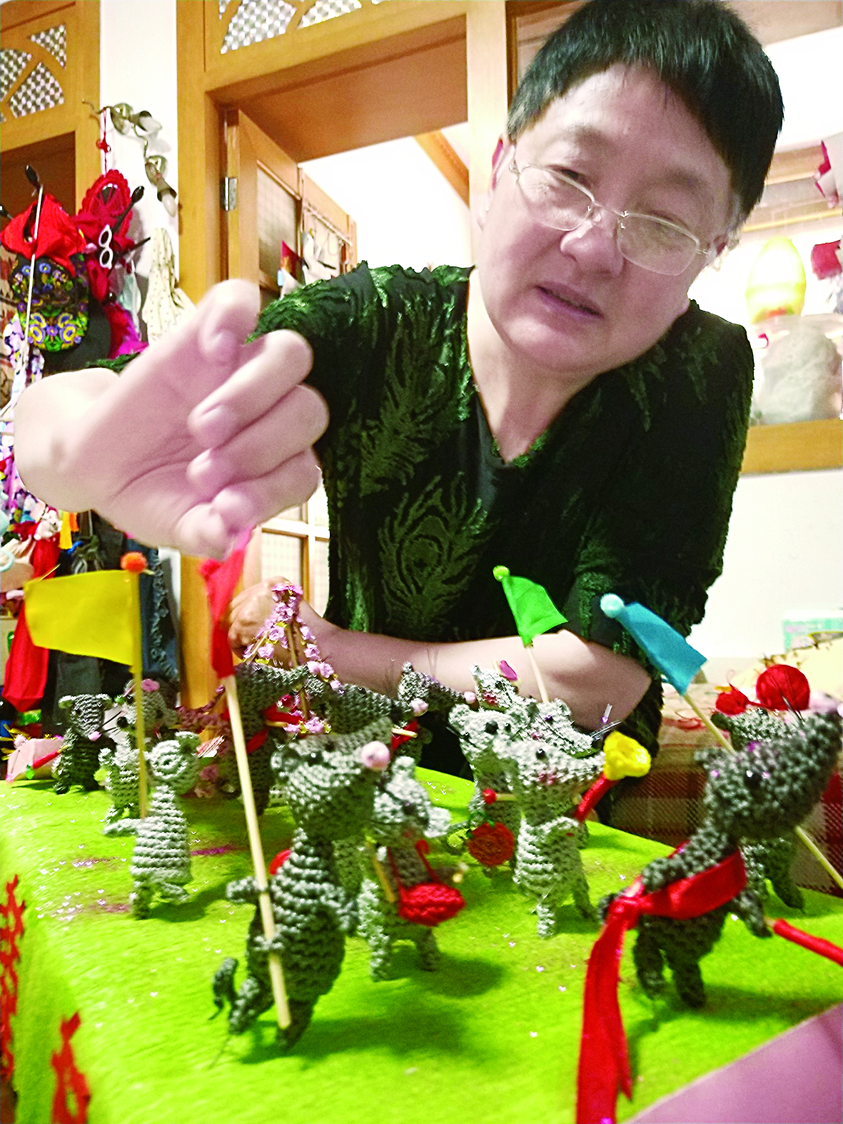 每晚11时许,将家人一切安置妥帖后,杨迎春才有一些真正属于自己的时间,编织一些手工饰品,直到凌晨一两点才休息。尤其是每年端午节前,她都会编织许多形色各异的香包,然后参加各种志愿活动,送给一些老人和曾经帮助过她的爱心人士。“这是老鼠新娘,这是新郎,这是媒人……”(如图)杨迎春向记者介绍的,是一组她刚制作完成的《老鼠嫁女》编织作品,花费了她大半年时间。