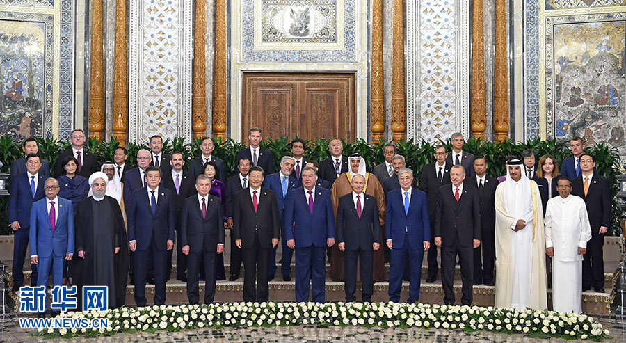6月15日,亚洲相互协作与信任措施会议第五次峰会在塔吉克斯坦首都杜尚别举行。国家主席习近平出席峰会并发表重要讲话。这是出席会议的亚信成员国领导人或代表,观察员国代表以及有关国际和地区组织代表集体合影。 新华社记者 张领 摄