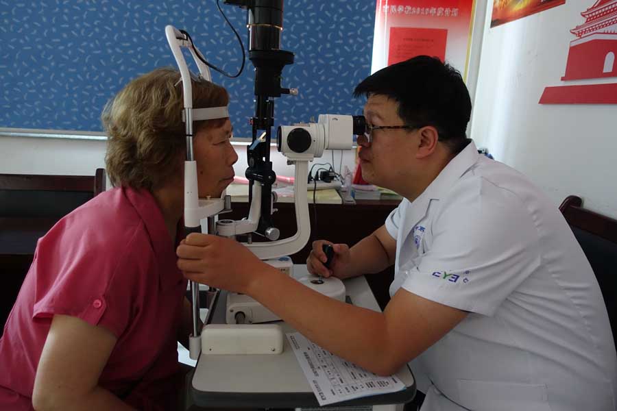 6月14日,市第一医院眼科主治医师行磊给盐湖区四季绿城社区的居民检查眼底。