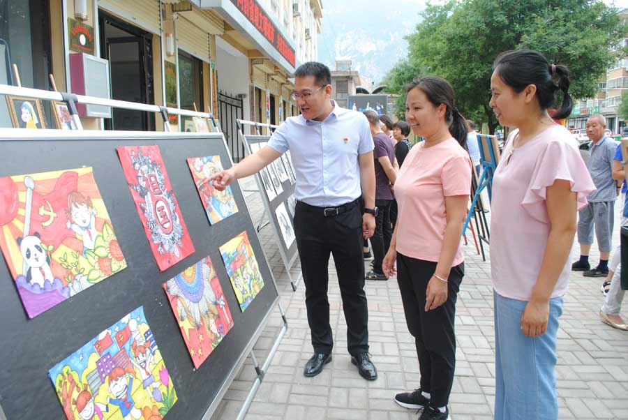 6月17日,永济市蒲园社区服务中心广场上,“庆‘七一’、迎国庆·童心向党”书画展活动吸引了市民前来观看。