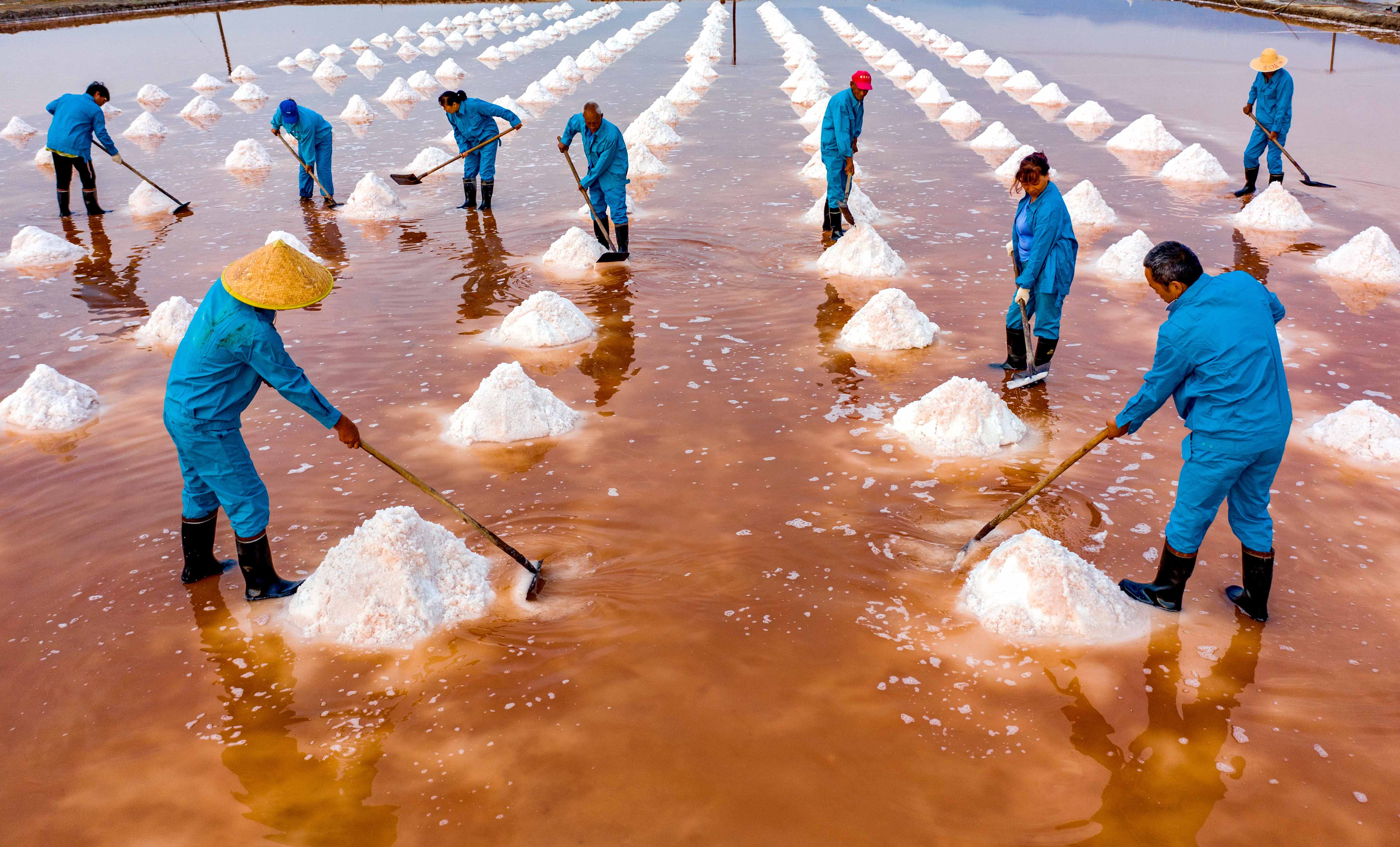 眼下,盐湖进入潞盐铲收期,工人采用传统工艺“五步产盐法”铲收原盐。盐湖产盐历史悠久,是全国著名的化工原料基地。“五步产盐法”2014年被列为国家级非物质文化遗产。据悉,盐湖所产的潞盐有很高的医用价值,目前主要用于生产浴盐等美容用品。
