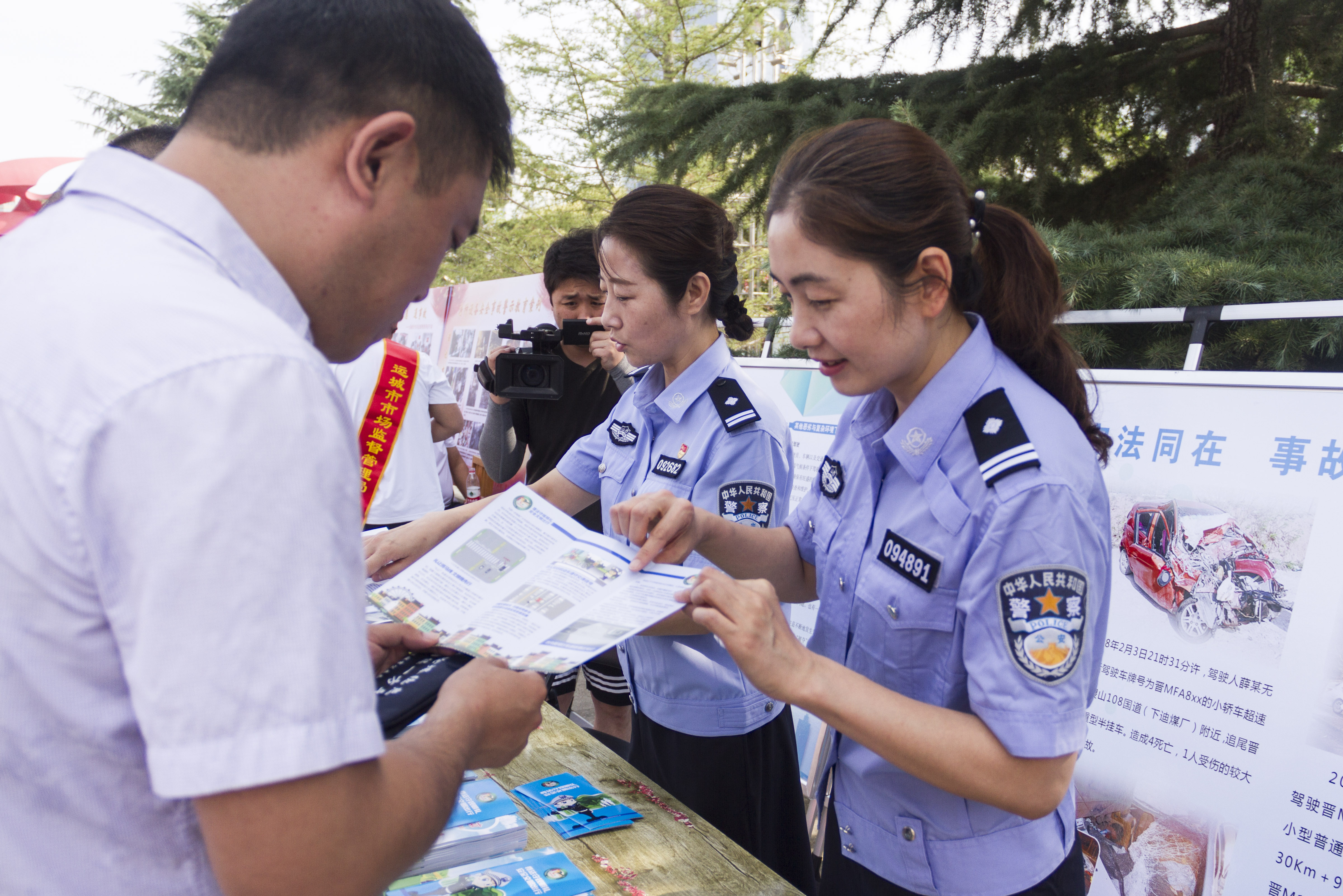 6月16日上午,民警在市区南风广场,向市民讲解交通安全知识。