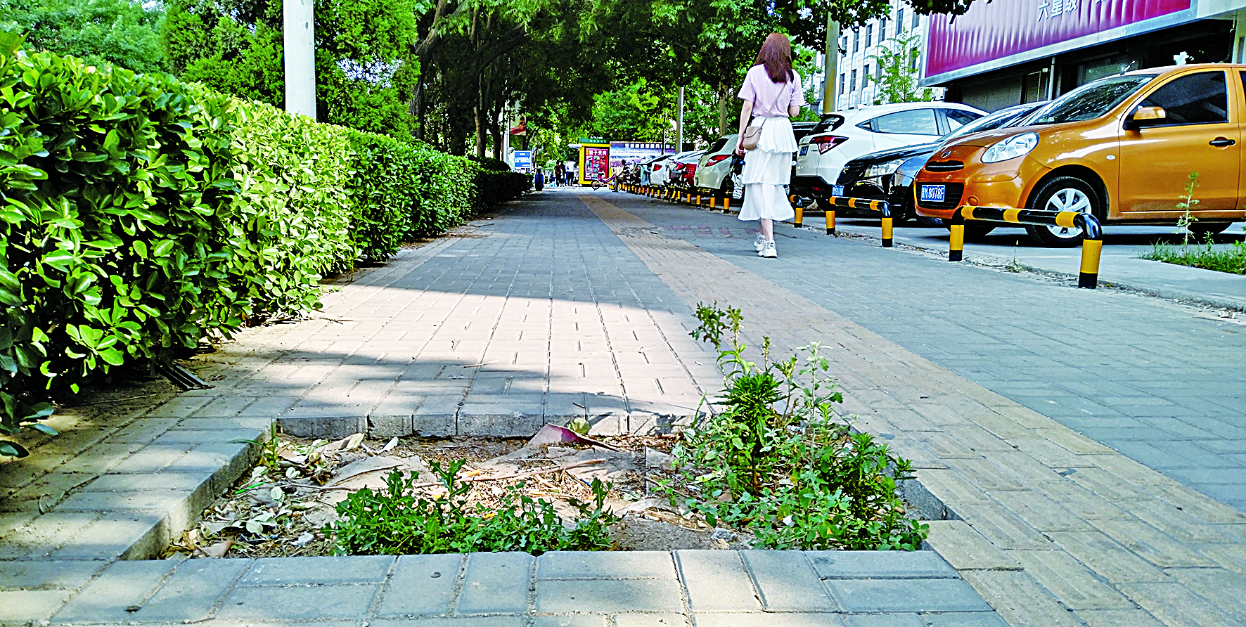 ▲市区库东路东边人行道原本平坦整齐,不知何时,上面铺设的地板砖缺失几块,还涉及到盲道。这既妨碍出行,又影响美观,附近市民呼吁有关部门早日将其修复。 任红星 曲林