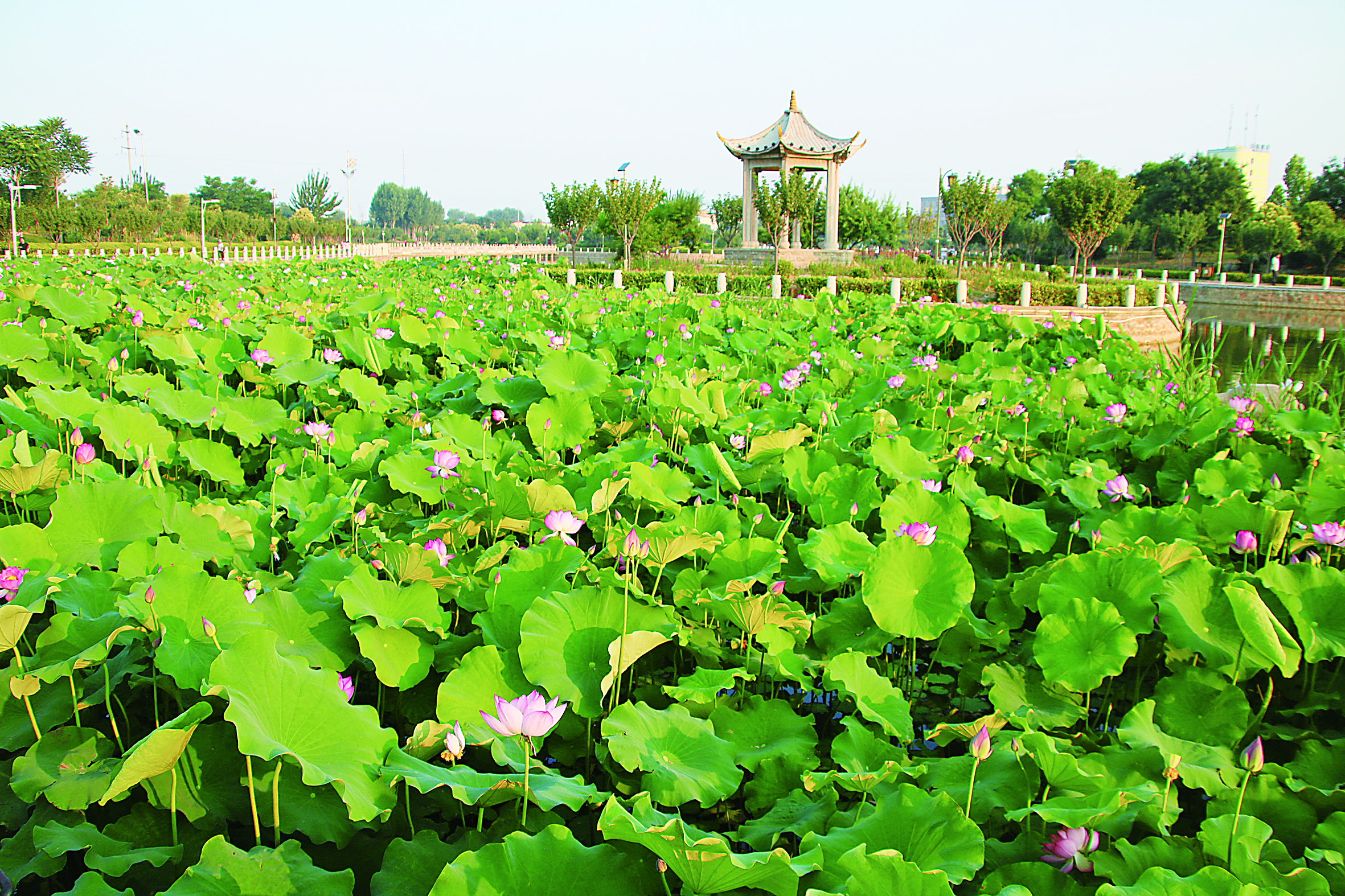 ▲6月18日早,永济市滨河公园里荷花绽放,一派“接天莲叶无穷碧,映日荷花别样红”的美景。
