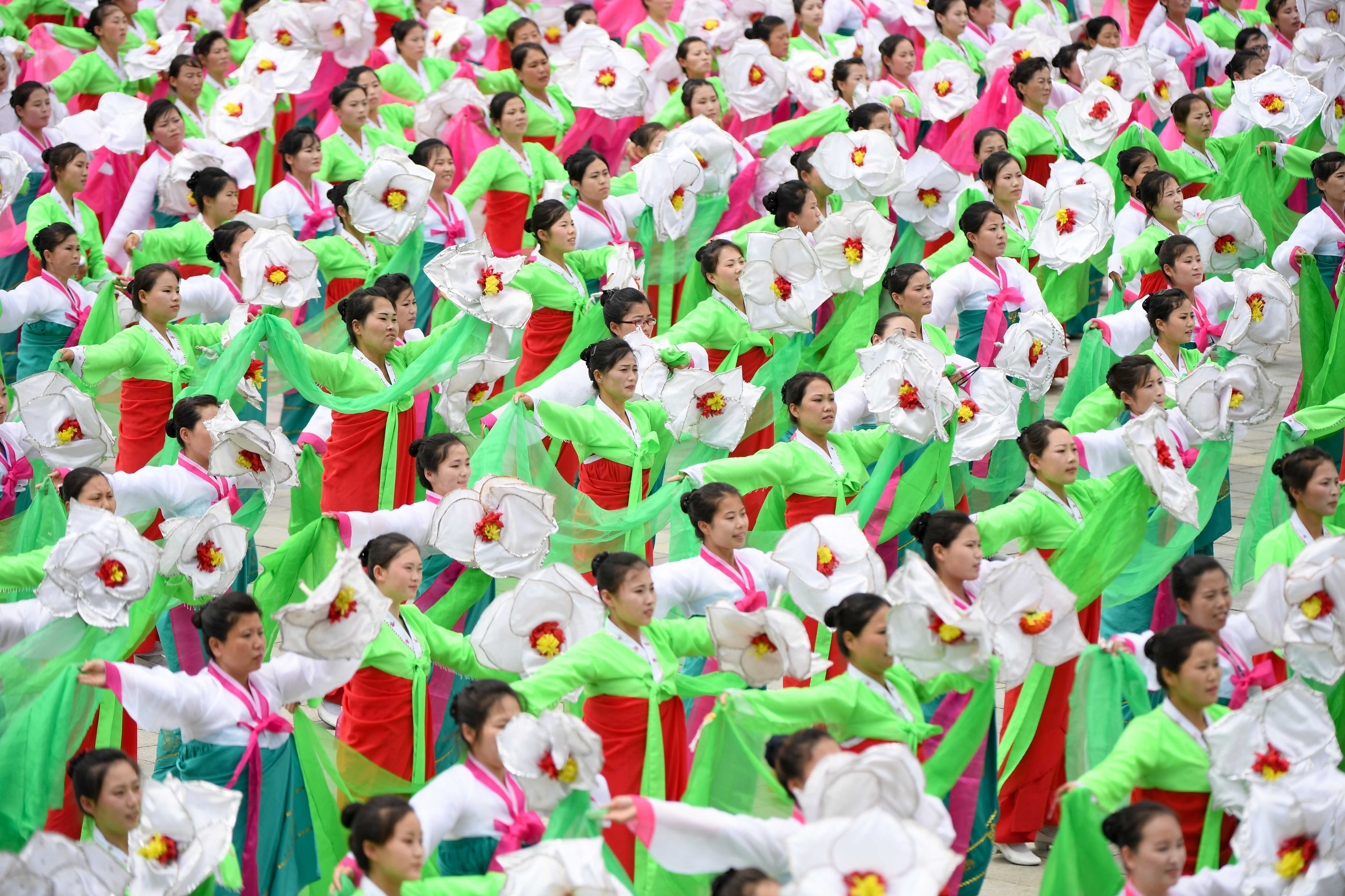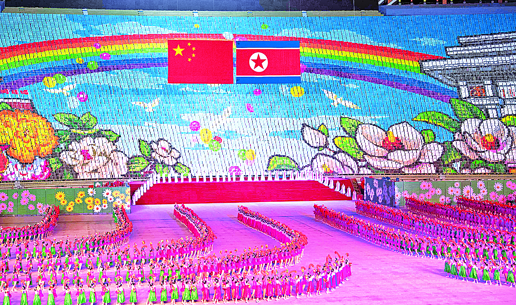 图3 6月20日晚,朝鲜举行大型团体操和艺术演出。这台演出是为习近平此次对朝鲜进行国事访问专门精心创作的,数万名朝鲜演员参加表演。演出在绚丽的焰火中拉开序幕。朝鲜三大乐团,国立交响乐团、功勋合唱团、三池渊管弦乐团首次同台献艺。整场演出气势恢宏,震撼感人。