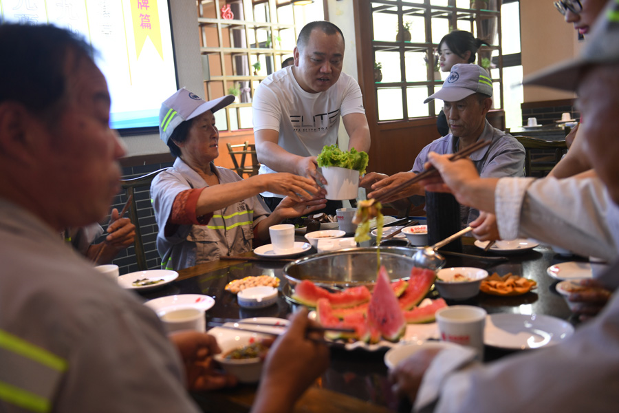 6月21日,市区条山街一饭店内,该店经理吕桂山在为环卫工人端菜。70余名环卫工人欢聚一堂,免费品尝店里为他们提供的各种美食。