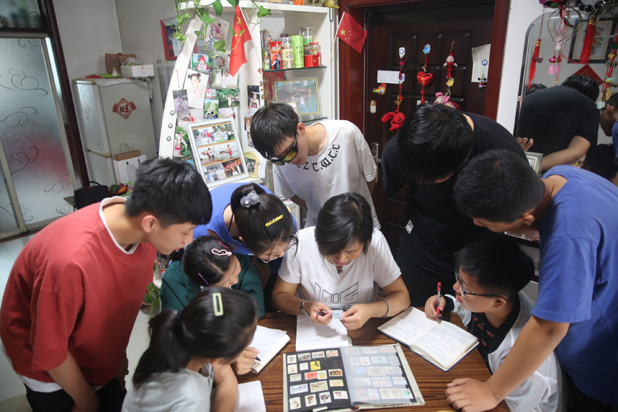 6月22日,在永济市市民张菊红家里,几名小学生在兴致勃勃地观看党史、国史和家乡变迁等方面的邮票。