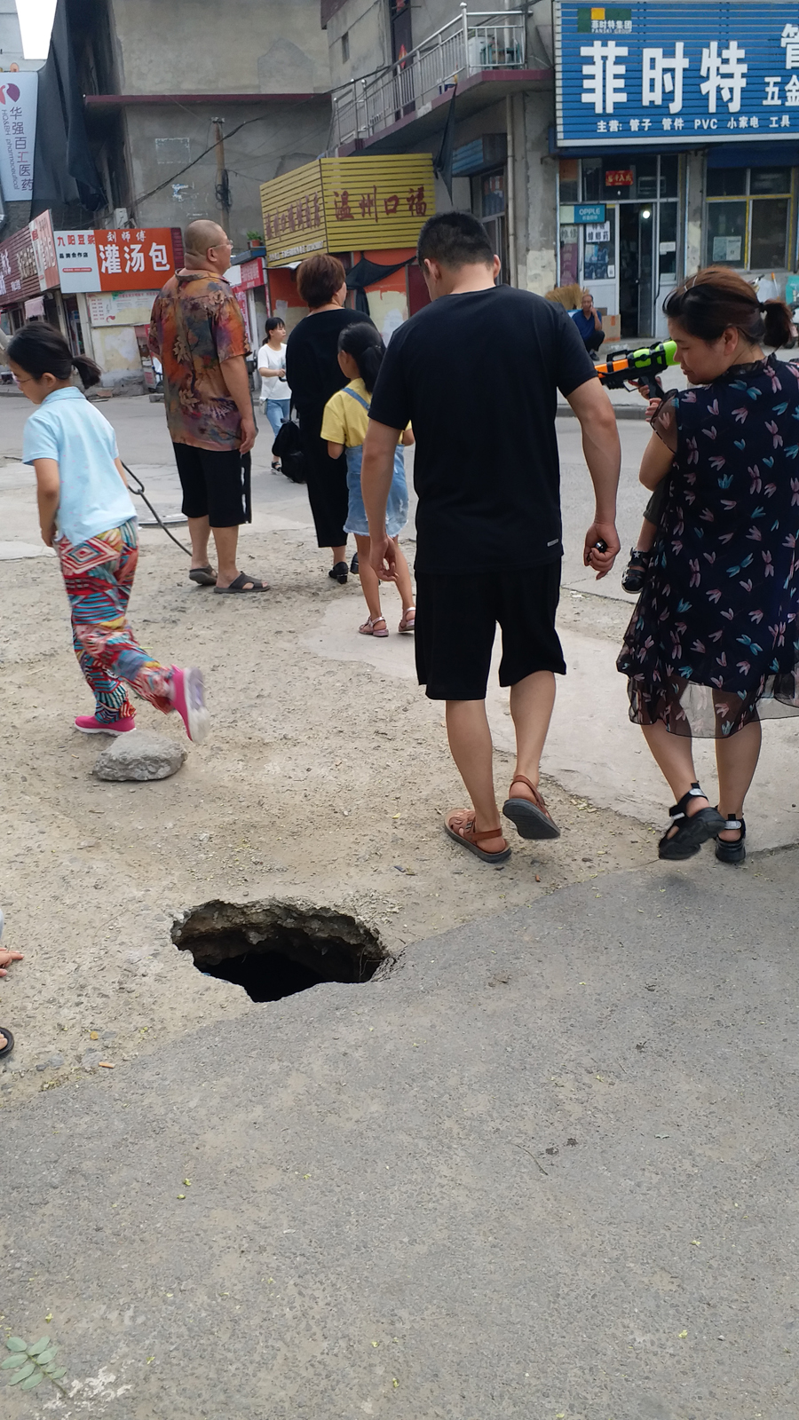 附近商户说,这个空洞大概出现在6月21号下午,当时正下大雨,突然,一阵“扑扑”的声音传来,他们走近一看,发现街角竟然出现了一个脸盆大小的深坑,着实将他们吓了一跳。
