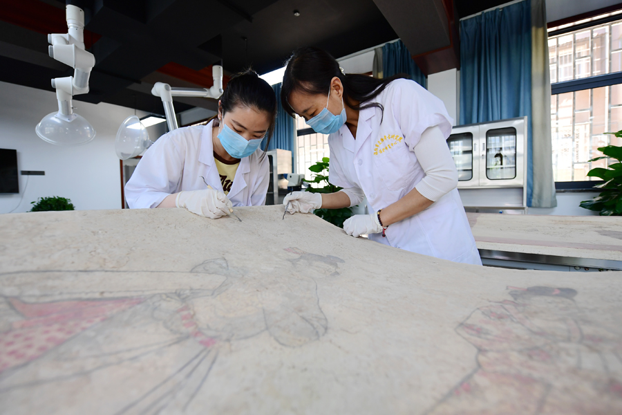 在洛阳市文物考古研究院,学生田丹玉(左)和壁画修复师田玉娥清理一件唐代壁画(5月22日摄)。