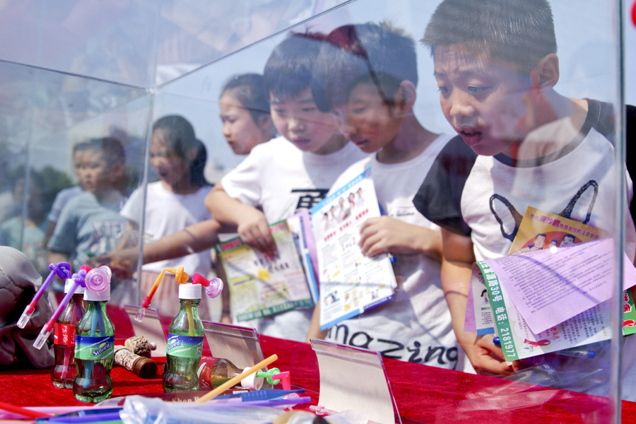 6月26日是第32个国际禁毒日。当日我市举行禁毒宣传活动,活动旨在让大家通过认识毒品危害,达到远离毒品的目的。图为学生们在观看吸毒工具仿真模型。 记者 樊朋展 摄