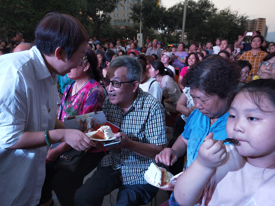 为了庆祝建党98周年,晚会中间,由福同惠食品有限公司制作的三层大蛋糕被推上舞台,大家一起点上蜡烛,为党庆生。为了感谢辖区老党员对社区发展的贡献,盐湖区政府、中城办相关领导及社区干部将蛋糕切成小块,送给现场的老党员们(左图)。老党员丁海天激动地说,在中国共产党的领导下,祖国更加繁荣富强,人民生活更加美好,作为一名老党员,他感到幸福和荣光。