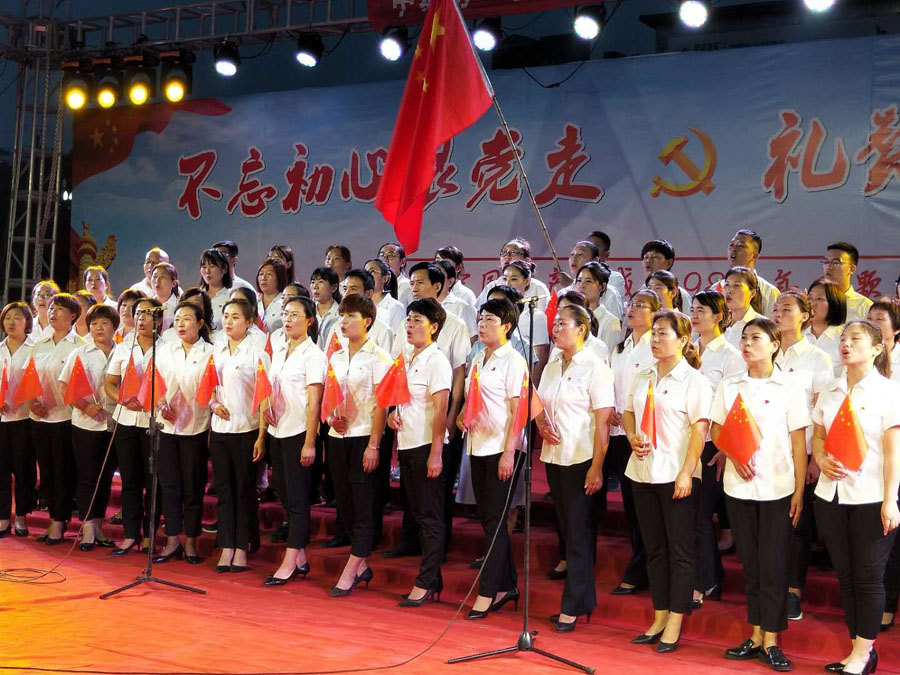 社区居民通过歌曲、舞蹈、快板、二胡、武术、朗诵等不同的表演形式,庆祝中国共产党成立98周年。独唱《再唱山歌给党听》、二胡《赛马》、舞蹈《人说山西好风光》《健康快乐舞起来》《不忘初心》等节目一一上演,表达了群众对党的感恩之情。最后,所有社区工作人员舞动着鲜艳的五星红旗,共唱歌曲《没有共产党就没有新中国》《我和我的祖国》《歌唱祖国》,表达了对党、对祖国的赞美与热爱,将演出推向高潮。