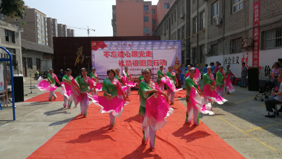 随后,300余名社区居民齐聚社区大院,开展了庆祝中国共产党建党98周年文艺汇演。现场,全体在座人员高举手中的国旗,合唱《没有共产党就没有新中国》;社区老年方韵舞蹈队为大家表演了舞蹈《我和我的祖国》,献礼建党98周年。