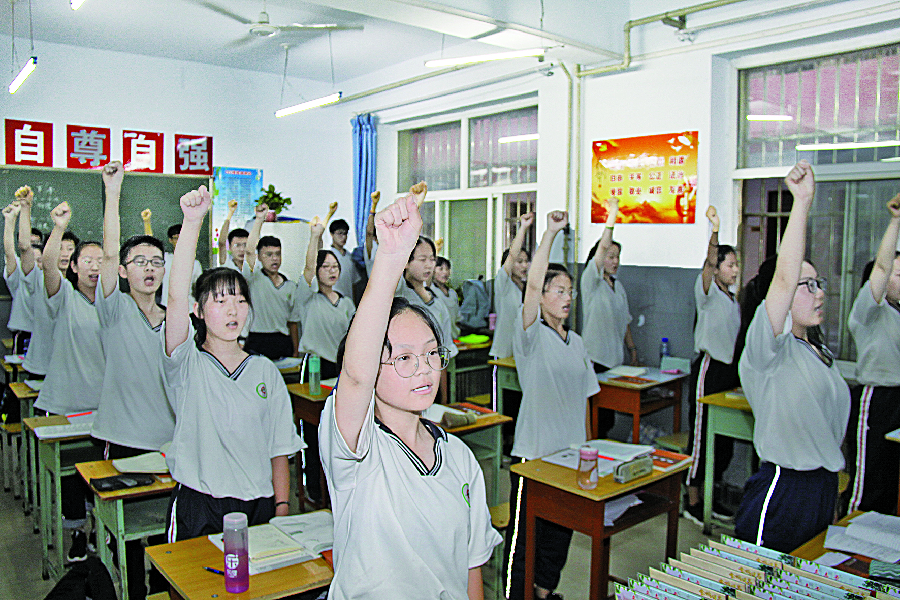 ▲6月25日,运城市盐湖二中高二年级的学生正在老师的引领下,向参加开放日活动的家长展示课前励志宣誓。