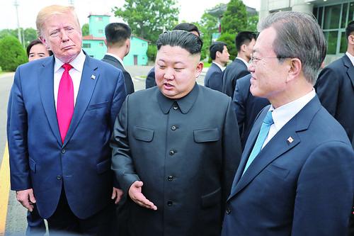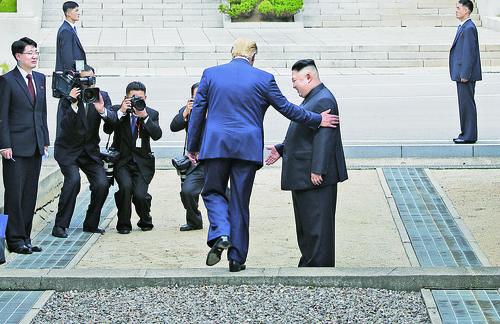 这是两人继新加坡和河内会晤后的第三次会面。之后,特朗普和金正恩再次跨越军事分界线(上左),来到韩方一侧,与等候在“自由之家”的韩国总统文在寅举行共同会面(上右)。