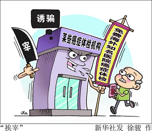 ▲明明没有病却被检查出癌症,打着“免费海外知名医院癌症体检”的幌子诱骗人上钩,一些癌症体检机构甚至雇佣无资质人员……近年来,癌症体检受到不少人追捧,但记者调查发现,这些看起来“高大上”的癌症体检机构和项目,背后猫腻不少、问题重重。 新华社发 徐骏 作