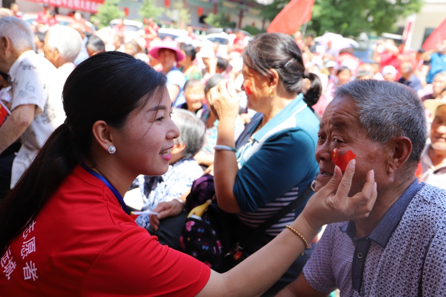 图为志愿者帮老人贴上中国地图贴纸