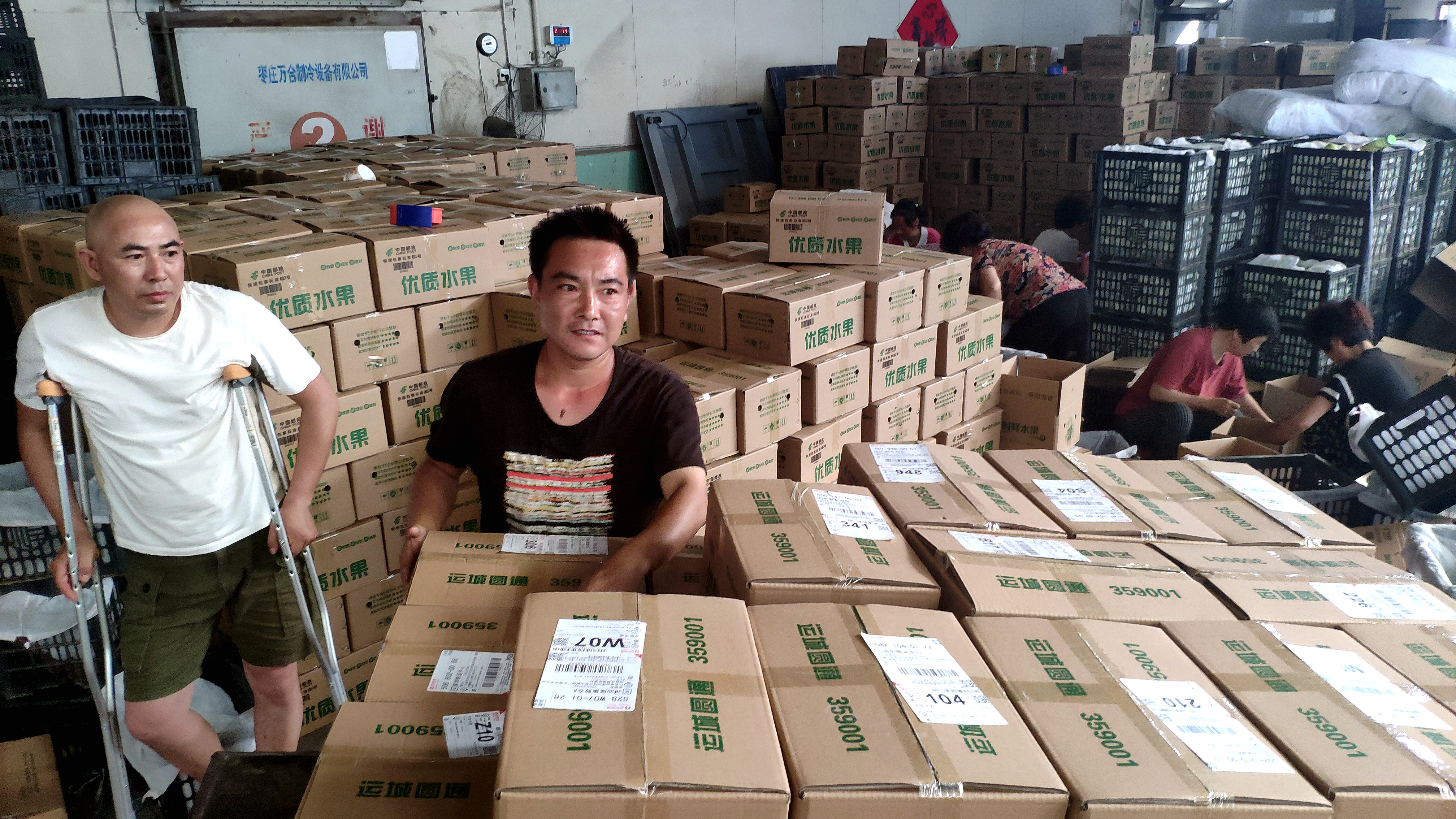 在北景乡张村的亲亲果库,电商王科正在组织人员发货,果库的大棚下,包装的、封箱的、装车的,十几号人干得热火朝天。