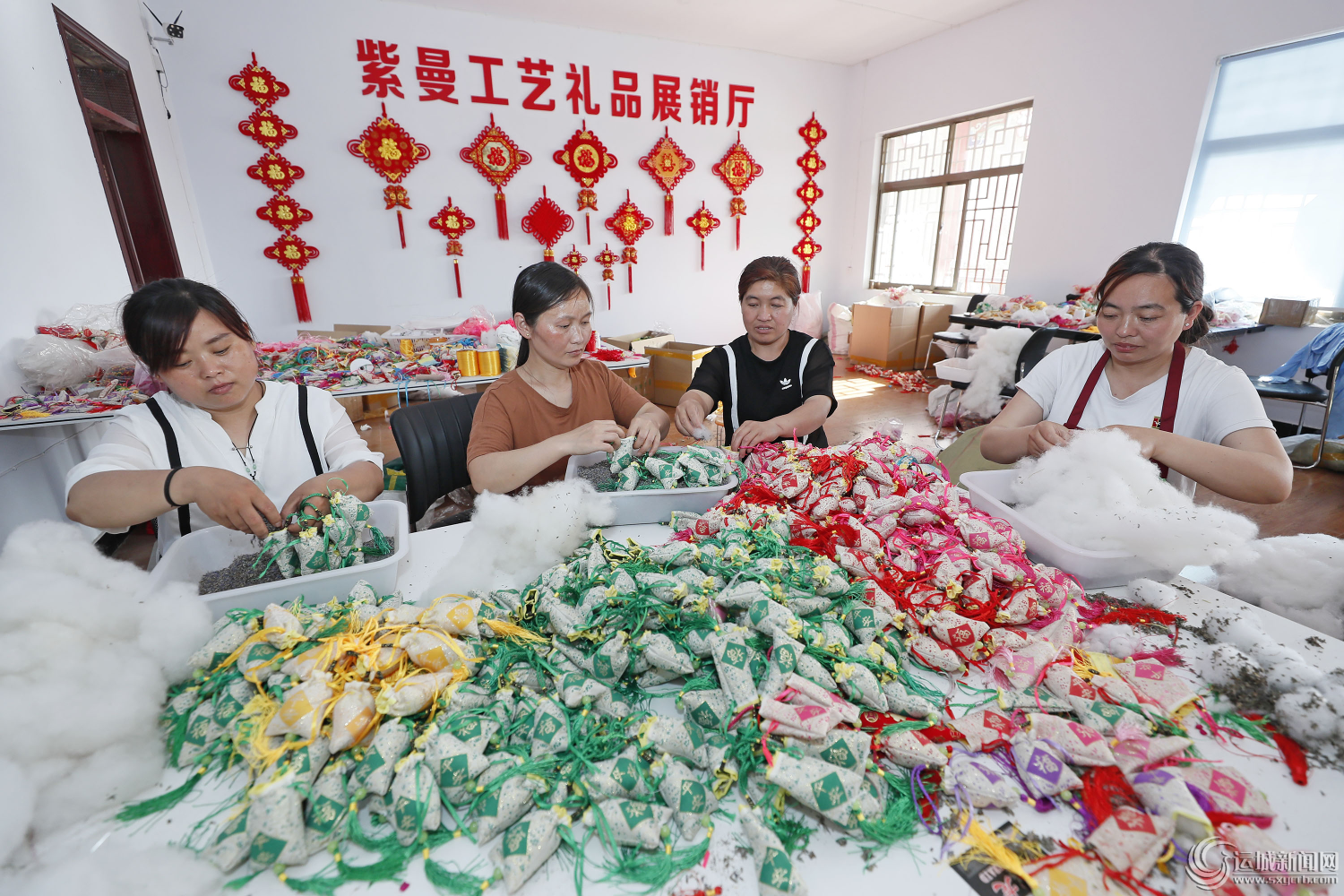 在垣曲岭回村“扶贫车间”,留守妇女在加工香包挂件。该村“扶贫车间”由返乡创业人员许金金投资100万余元创办,带动村民就业100余人,月增收一千到三千元不等。 本报记者 闫 鑫 摄