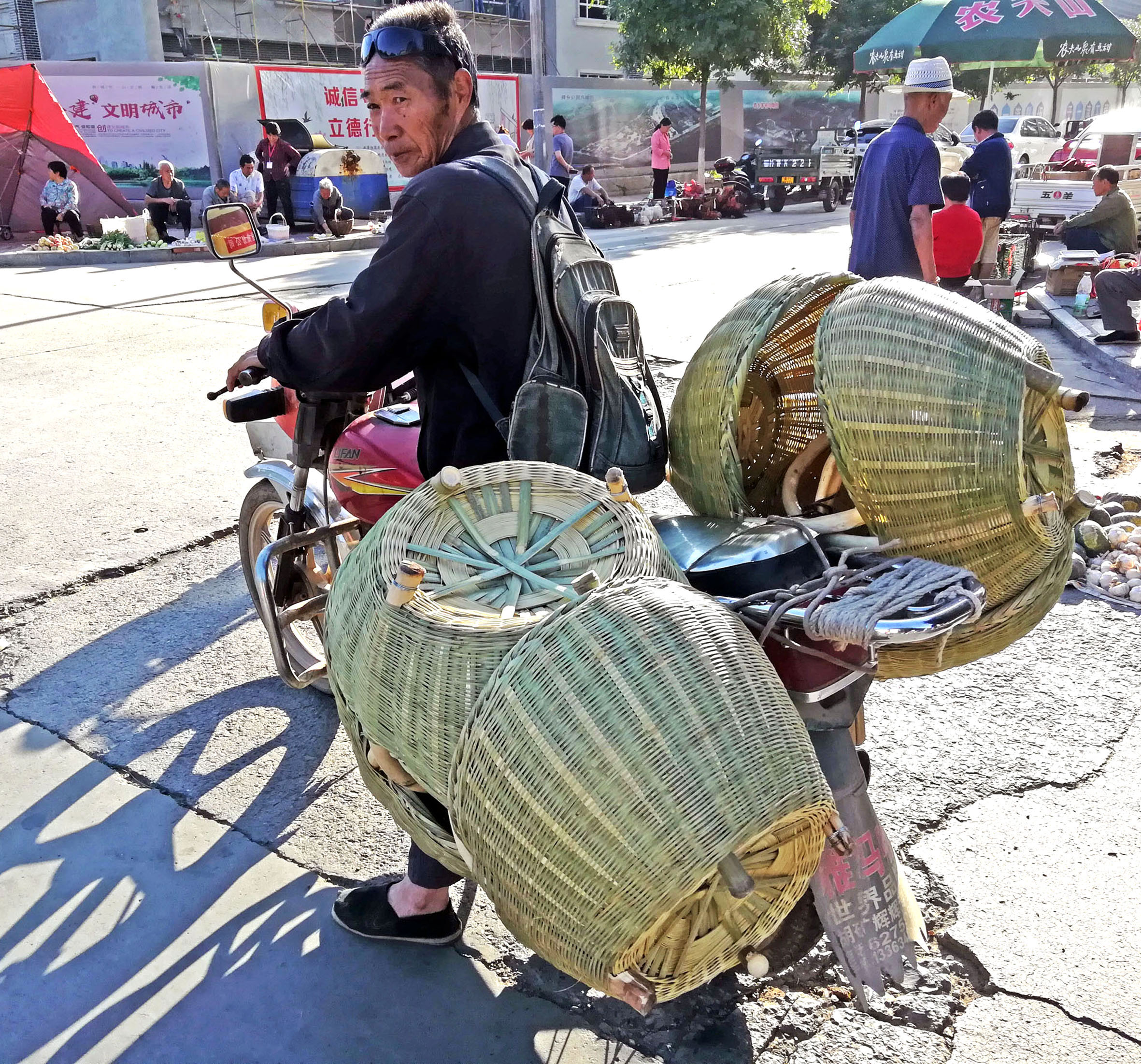 7月7日,垣曲县毛家镇南山村竹匠魏宝才一大早就骑着摩托车赶往农贸市场销售竹筐。