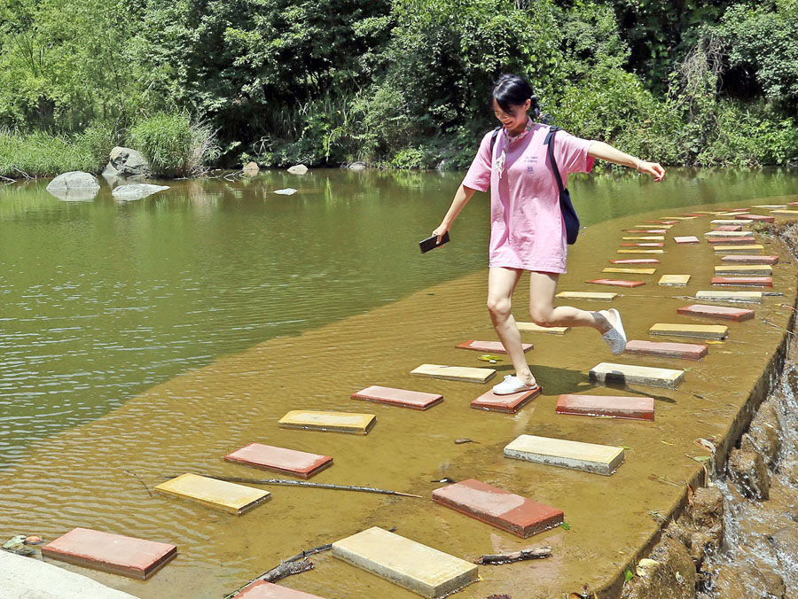 7月13日,一名游客在垣曲县望仙大峡谷风景区浅水潭感受跳河石乐趣。