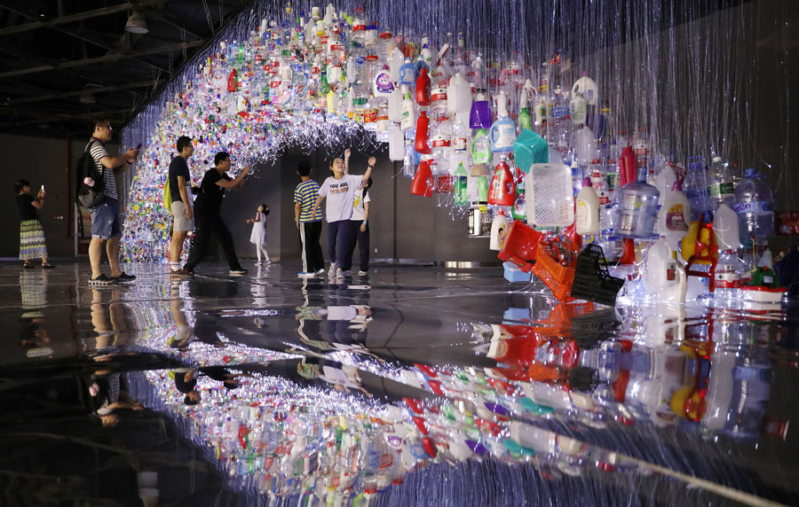 7月14日,观众在参观由回收塑料制品组成的装置艺术作品“巨环”。