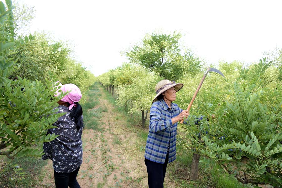 7月13日,盐湖区三路里镇的村民在地里收割槐米。