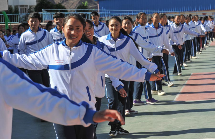 ▲西藏昌都市芒康县盐井中学学生课间在操场跳弦子操(6月6日摄)新华社记者 晋美多吉 摄