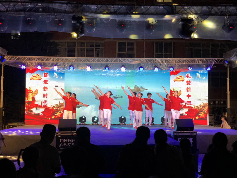 晚会现场,社区居民将“奋进新时代、礼赞新中国”录入舞台背景荧幕,庄重的红旗和喜庆的红色大字,为舞台增添了喜悦气氛。伴随着舞蹈《俺们会跳花鼓灯》的开始,晚会正式拉开帷幕。广场舞《三大纪律八项注意》跳出了居民积极向上的精神风貌;快板《夸社区》用朗朗上口的押韵语句,将社区的新变化、新风尚融入其中,表现出居民对社区的热爱,也鼓励了在场居民为社区服务;眉户表演《十二把镰刀》《刘春兰》《村官》受到戏曲爱好者的喜爱。