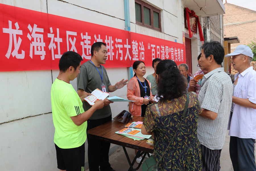 7月15日,闻喜县龙海社区主任芦卫民(左二)带领工作人员向辖区居民宣传整治违法排污工作意义和要求。