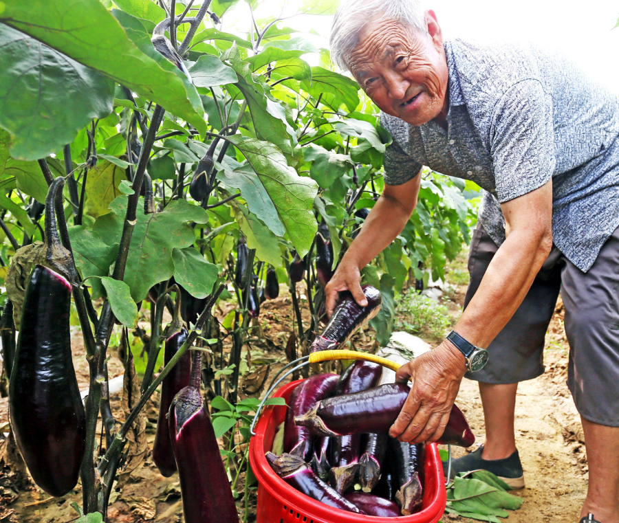 7月21日,垣曲县长直乡前青村村民文林,在自家菜园里采摘茄子。
