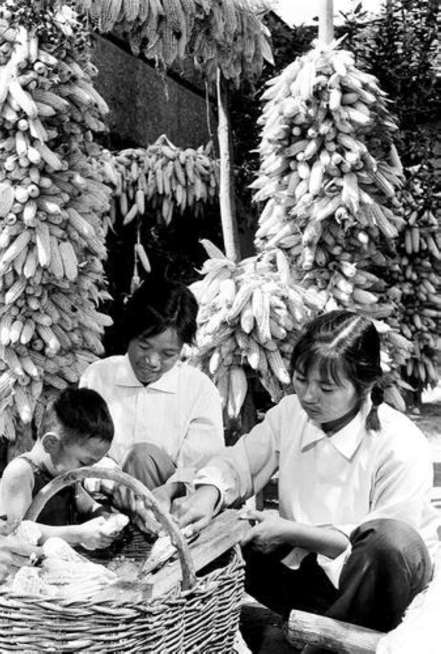 1979年9月,“三中全会”后第一年,万荣县王显村妇女喜搓丰收的玉米。