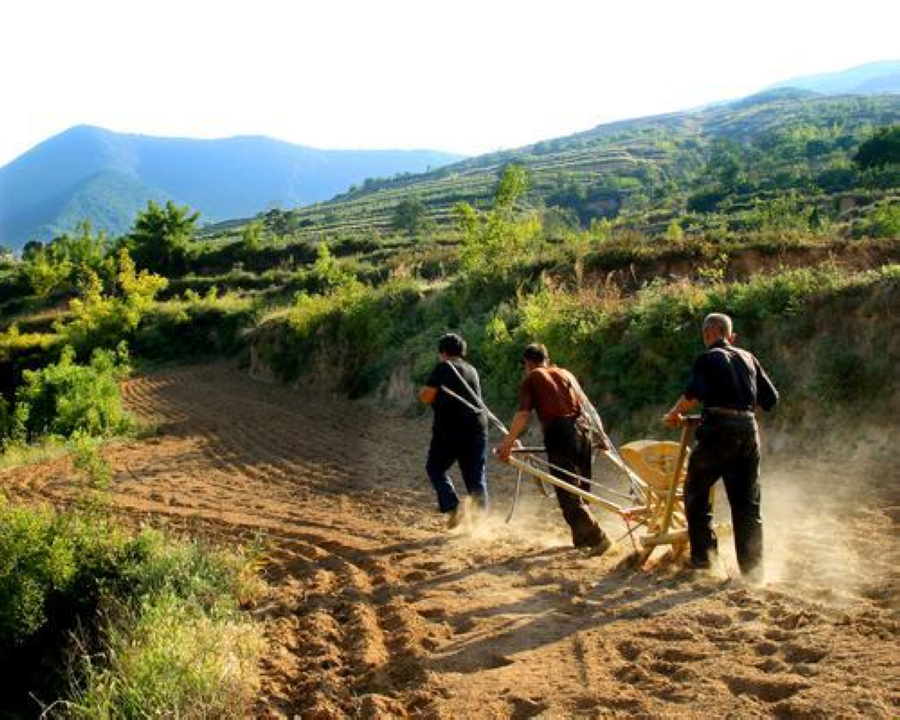 2007年9月27日,万荣县柳家院村村民用人拉耧的办法,将山上机械无法耕种的小块地也种上了小麦。