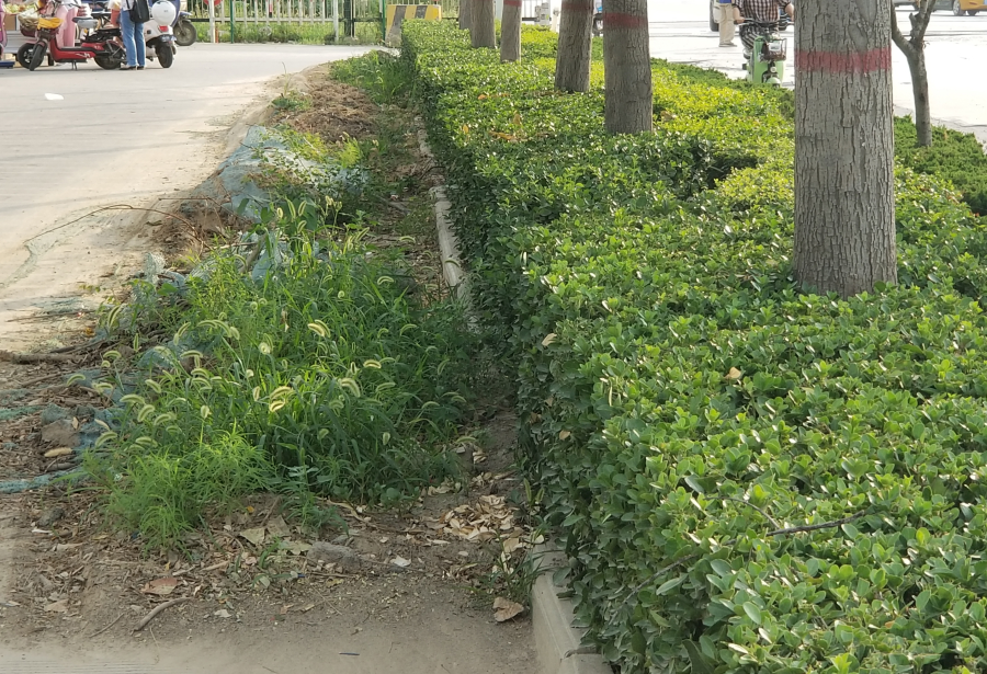 ▲绿化带旁堆积着垃圾、杂草。 范楚乔 摄
