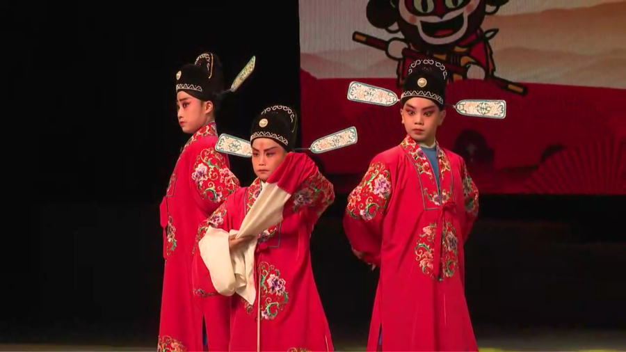▲3名小选手在第23届中国少儿戏曲小梅花荟萃活动中表演剧目《夜审》