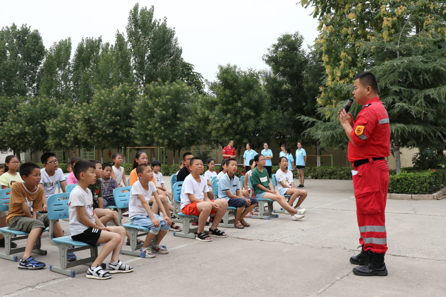 支教过程中,结合假期孩子们容易遭遇的一些突发意外,志愿者还联系了天龙救援队运城支队,给孩子们带来了一场别开生面的安全教育实操演练。