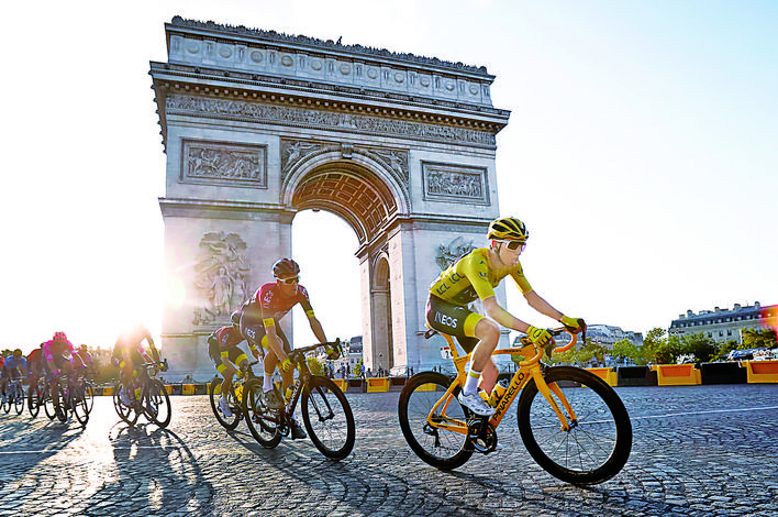 ▲7月28日,英力士车队的哥伦比亚车手贝尔纳尔(右一)和车队一起从凯旋门前驶过。 当日,经过21个赛段、3366公里的较量,第106届环法自行车赛在巴黎香榭丽舍大街落下帷幕。英力士车队的贝尔纳尔以82小时57分的总成绩,成为环法历史上首位加冕总冠军的哥伦比亚车手。英国车手托马斯获得亚军,荷兰车手克鲁伊斯维克获得季军。 新华社/美联