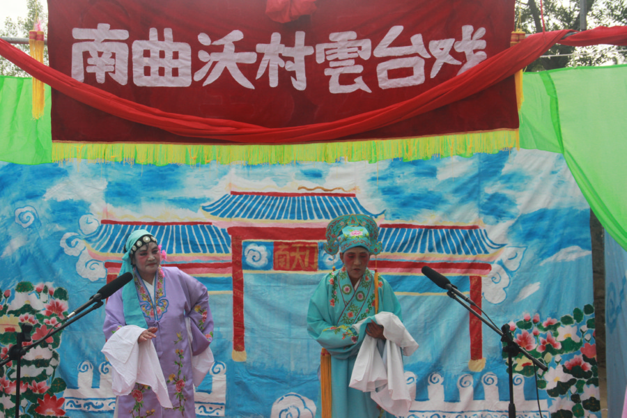 大门东侧是一个简易舞台,两位演员已经粉墨登场,正在投入地演唱蒲剧。这支队伍来自三门峡陕州区南曲沃村。56岁的赵秀丽正在候场,她扮演的是个丫鬟。“我们凌晨3点多就出发往这里赶,为的就是在关老爷生日这天为大家唱戏”。