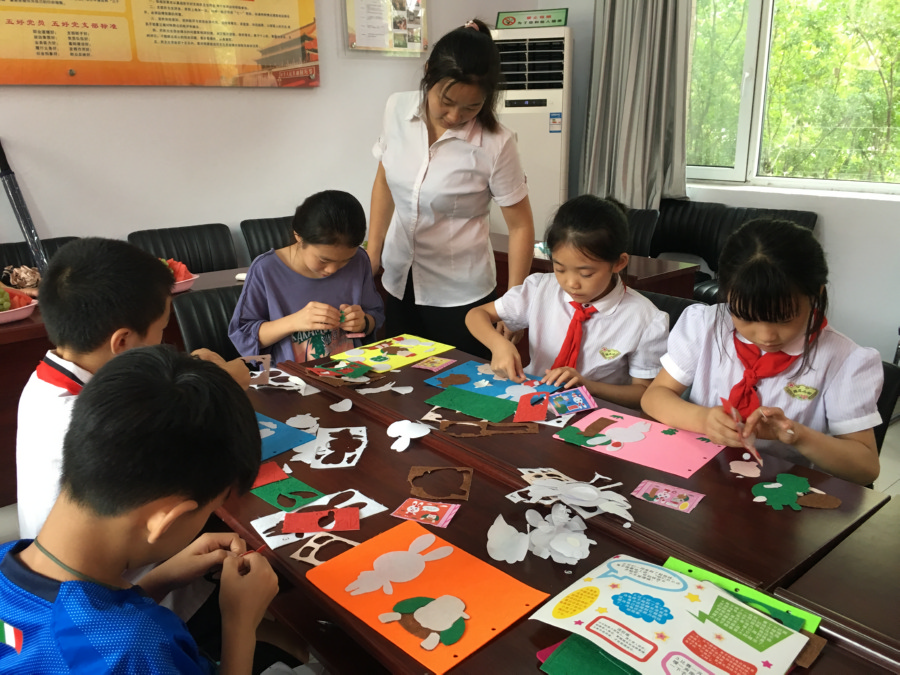 本次活动以制作DIY儿童绘本为主,社区工作人员给孩子们介绍了各种材料的用途及制作方法。孩子们领到不同颜色的卡片后,发挥想象力,按照说明书剪下自己需要的部分进行粘贴(下图)。不一会儿,《乌鸦取水》《龟兔赛跑》的故事就展现在大家眼前。