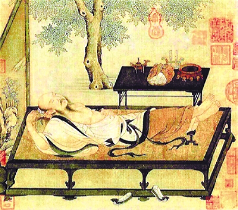 北京故宫博物院藏有一幅宋代画家(佚名)所作的《槐荫消夏图》,它描绘了一位文人在树荫下怡然自得的消夏情景。庭院中的一株槐树,枝叶繁茂,浓荫下,一人袒胸露怀,仰卧在凉榻上闭目养神,高高翘起的赤足更显其超然洒脱、悠闲惬意。床头立着一面屏风,上面绘有雪景寒林图,与乘凉的氛围很融洽,让人顿有凉爽之感。在旁边的几案上,放着书卷、茶具等物件。可见在品茗清茶、阅览书卷之后,一阵凉风袭来,这位文人顿觉困意,躺在凉榻上打盹。这幅作品人物刻画细致,设色古雅,行笔飘逸柔美,气韵清新优雅,流露出一种沉静、安逸的韵味。