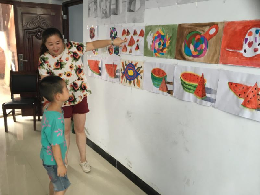 活动现场,十余位小朋友及家长边参观边讨论孩子的作品。孩子们运用手中的笔,通过自己的想象,让我们看到五彩斑斓的正方体、鲜红的西瓜等,面塑作品有执勤的警察、可爱的长颈鹿、躺着的佩奇等,这些作品充满活力,妙趣横生,洋溢着孩子们天真烂漫的思想感情和大胆的想象,表达对未来的向往,对祖国的热爱。随后,每名小朋友给大家介绍他们的作品,并讲解其中的意义。潘以诺有点害羞,他的妈妈亲自上台给大家介绍孩子的作品,并高兴地说:“通过一暑假的公益课学习,孩子变得懂事多了,回家主动帮妈妈干家务;绘画也有了一定基础,学会运用色彩表达自己的想法。”