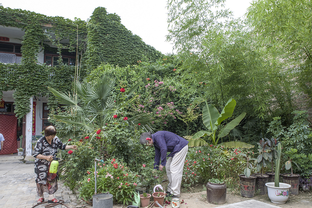 ▲8月2日,万荣县谢村村民郭忠民和妻子在院里管理月季花。