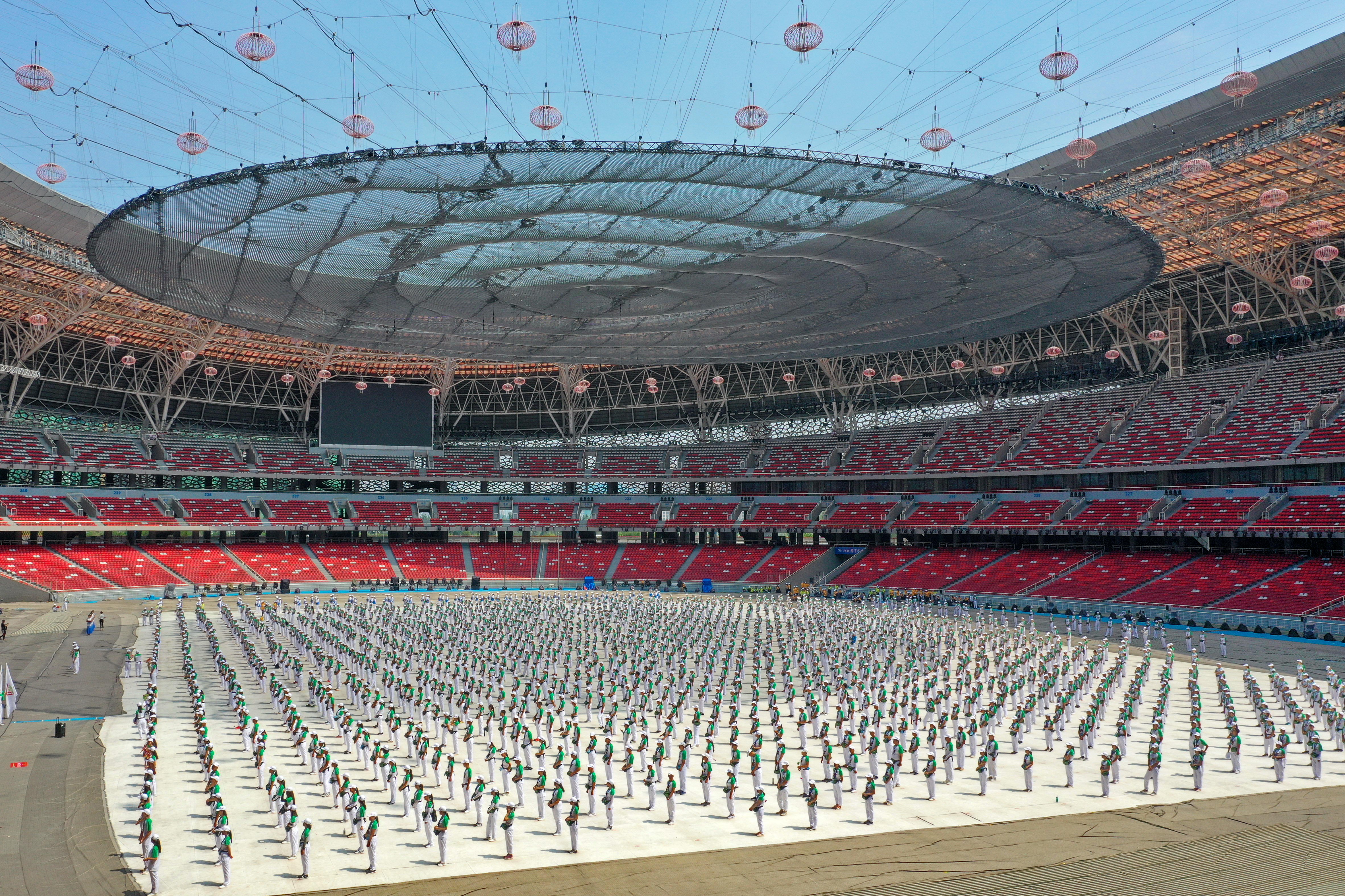 ▲这是8月2日拍摄的第二届全国青年运动会开幕式志愿者誓师大会现场(无人机拍摄)。