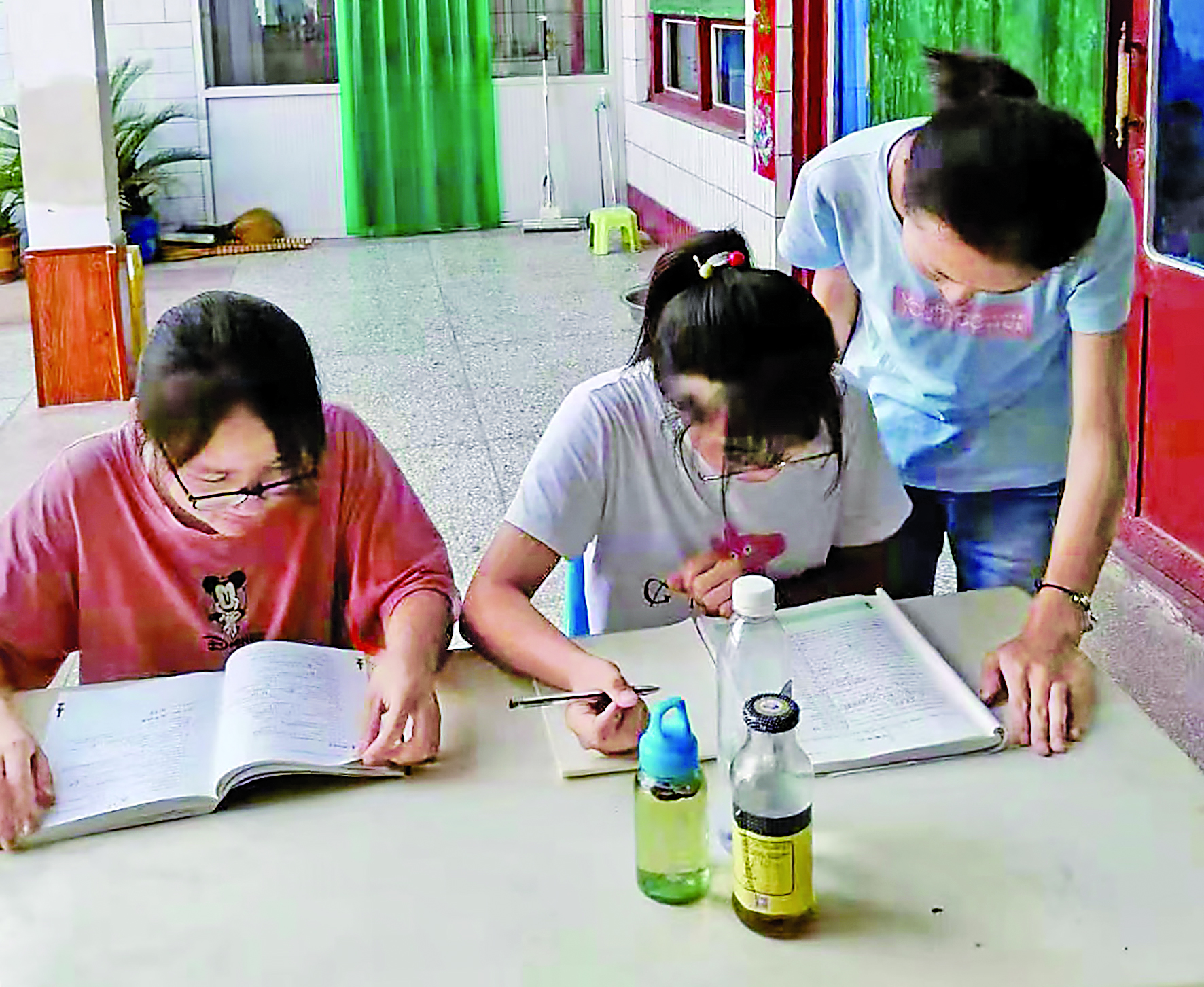 ▲蔡梦桐(右一)在辅导学生学习 刘凯华 摄