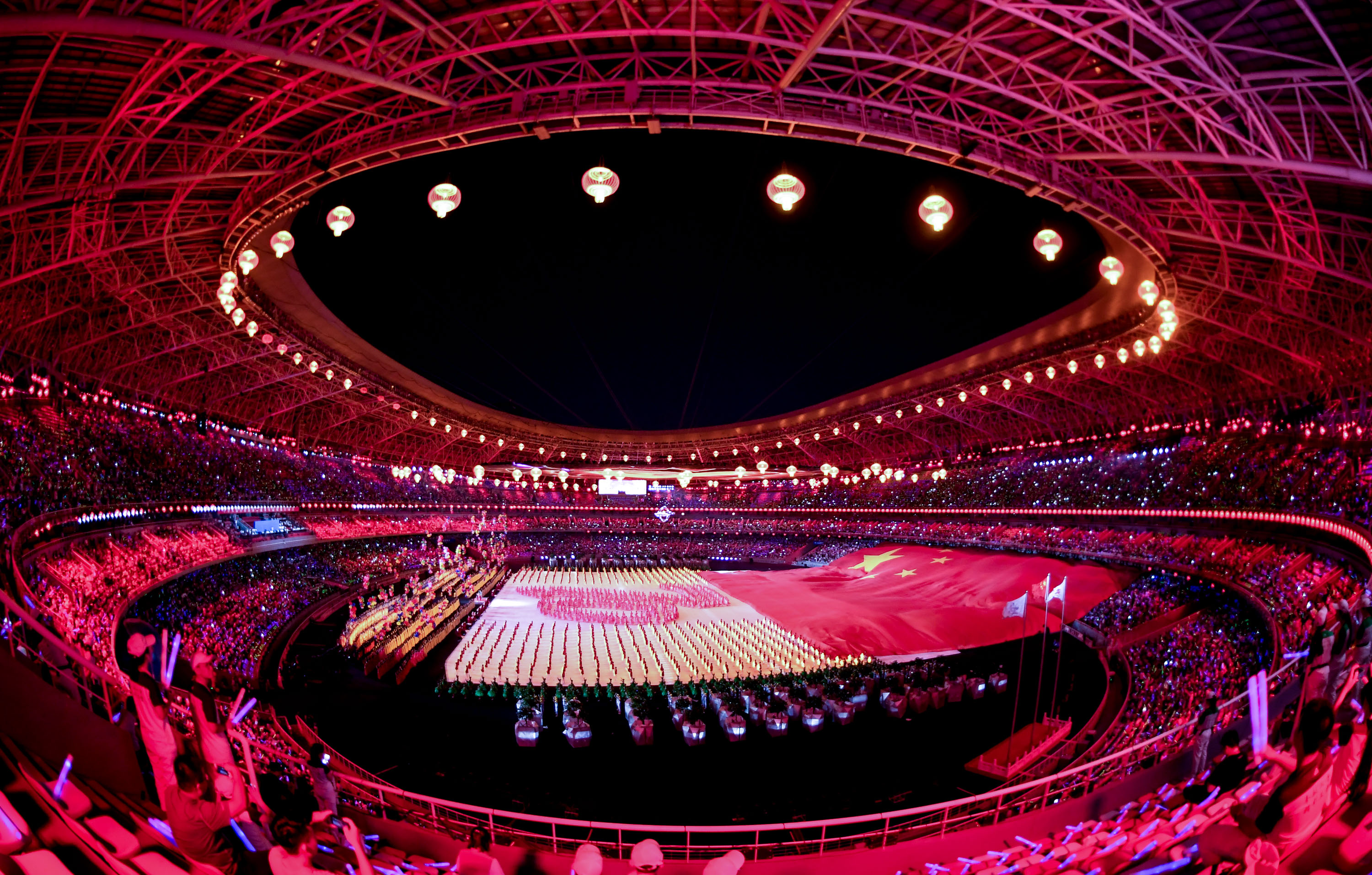 这一晚,红灯笼体育场炫彩夺目,科技“范儿”十足。一块直径达80米、面积达5024平方米的巨型天幕悬挂在场地正上方,可升降的巨型网幕与8000平方米的地面舞台,实现了720°视觉效果和沉浸式演出,带来了超级震撼的视觉体验。