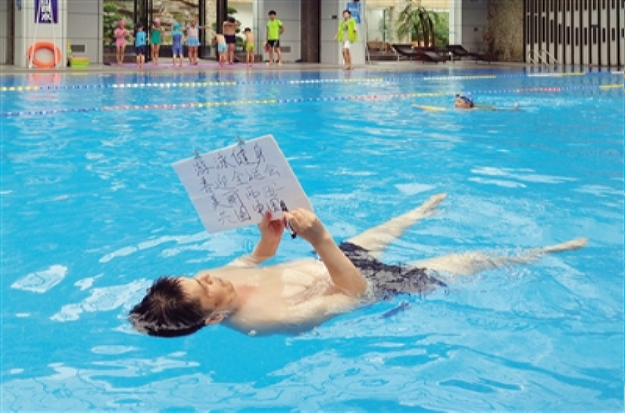 水上写字、看报、转手帕、颠乒乓球、玩小魔术……西安一位年过五旬的游泳馆救生员,凭着对游泳运动的热爱,将其玩出了“新花样”。