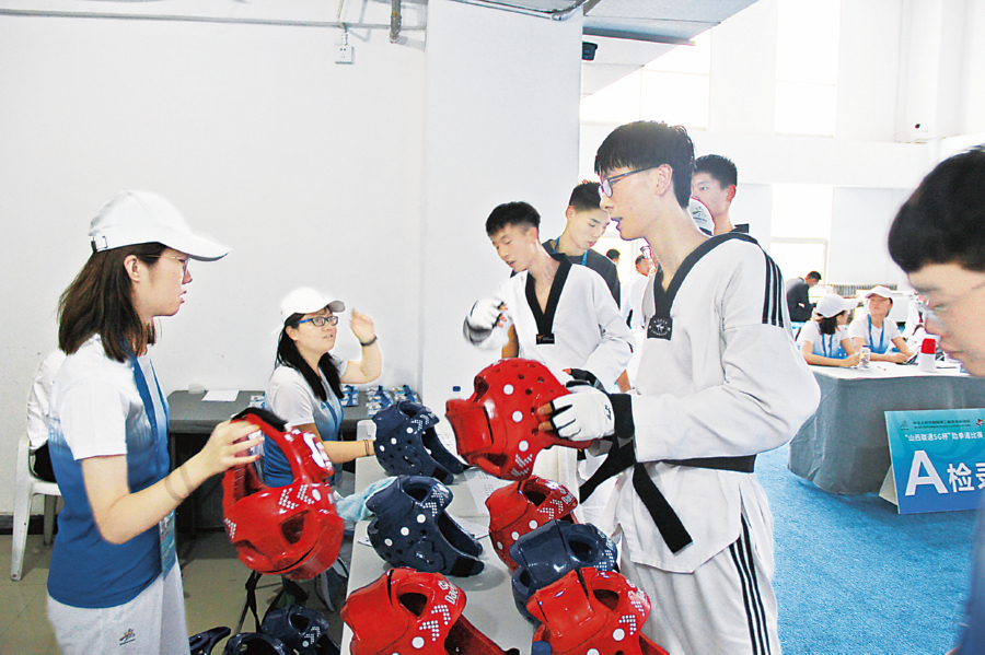 每位运动员上场前,都必须经过三道检录关。本届青运会,跆拳道竞委会裁判组对每一项检录都严格把关,保证运动员公平参赛。当日现场,来自临汾的国家一级裁判党世将,负责检录区的“一检”工作。